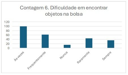 6. Com que frequência você tem dificuldade em encontrar objetos dentro da sua bolsa, especialmente em ambientes com pouca iluminação?