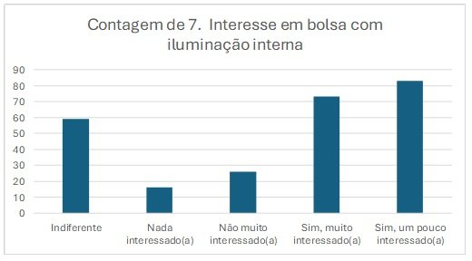 O interesse foi alto, validando a funcionalidade como atrativa. Isso significa que a luz interna pode ser um argumento central na proposta de valor e campanhas de marketing. Os resultados indicam que 73 participantes demonstraram estar muito interessados em uma bolsa com iluminação interna e outros 83 afirmaram ter algum interesse, ainda que em menor grau. Por outro lado, 59 se mostraram indiferentes, 26 declararam estar pouco interessados e apenas 16 disseram não ter interesse algum. Esses dados evidenciam que a maioria vê valor nessa funcionalidade, reforçando a relevância do recurso como diferencial do produto.