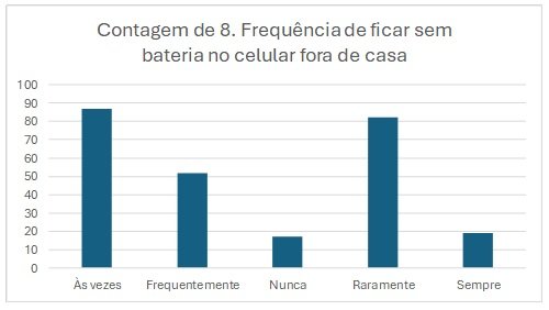 A maioria afirmou passar por esse problema com frequência. Esse resultado reforça a dor real do público e evidencia a relevância da entrada USB como parte fundamental do produto. Os dados mostram que 87 pessoas relataram ficar sem bateria no celular fora de casa às vezes, enquanto 82 afirmaram que isso ocorre raramente. Já 52 participantes indicaram que essa situação acontece frequentemente e 19 disseram que acontece sempre. Apenas 17 afirmaram nunca ter passado por esse problema. Esses resultados revelam que a maioria dos respondentes enfrenta, em maior ou menor grau, a necessidade de recarregar o celular fora de casa.