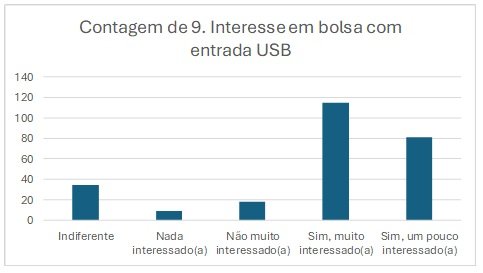 O interesse foi igualmente forte, mostrando que a funcionalidade dialoga diretamente com a rotina conectada do público. É um argumento de venda que gera identificação imediata. Os resultados revelam que 115 pessoas demonstraram estar muito interessadas em uma bolsa com entrada USB e 81 afirmaram estar um pouco interessadas. Em contrapartida, 34 se mostraram indiferentes, 18 disseram não estar muito interessadas e apenas 9 declararam não ter interesse algum. Esses dados indicam uma forte aceitação da funcionalidade de carregamento, reforçando seu potencial como diferencial competitivo.