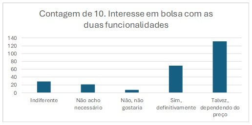 A aceitação foi ainda maior quando ambas as soluções foram combinadas, indicando que a proposta da Mi Power (iluminação + carregamento) é percebida como mais completa e valiosa pelo público. Os dados mostram que 131 participantes demonstraram interesse em adquirir uma bolsa que combine as duas funcionalidades, iluminação interna e entrada USB, dependendo do preço, enquanto 69 afirmaram que comprariam definitivamente. Por outro lado, 29 pessoas se mostraram indiferentes, 21 disseram não achar necessário e apenas 7 afirmaram que não gostariam de utilizar o produto. Esses resultados reforçam o apelo do protótipo, especialmente quando associado a uma estratégia de precificação adequada.