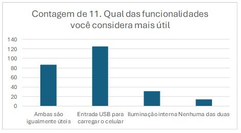Houve divisão, mas a entrada USB se destacou levemente como prioridade. Isso mostra que, embora a luz seja um diferencial interessante, a recarga do celular é percebida como necessidade. Quando questionados sobre qual funcionalidade consideram mais útil, 125 participantes destacaram a entrada USB para carregar o celular como a principal, enquanto 87 apontaram que ambas as funções são igualmente úteis. Já 31 consideraram a iluminação interna mais relevante e apenas 14 afirmaram que nenhuma das duas funcionalidades seria realmente necessária. Esses resultados evidenciam a maior valorização da função de recarga, mas também mostram que a combinação das duas agrega ainda mais valor percebido ao produto.