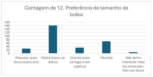 A preferência recaiu sobre bolsas médias, que equilibram estética e praticidade. Isso orienta o design inicial do produto, com foco em portabilidade sem perder espaço interno. Entre os respondentes, a maioria demonstrou preferência por bolsas de tamanho médio para uso diário, com 162 escolhas. Em seguida, 70 pessoas optaram por mochilas e 33 preferiram bolsas grandes para carregar mais objetos. As bolsas pequenas, voltadas para itens essenciais, foram escolhidas por 27 participantes. Apenas 6 declararam não ter interesse, não se interessarem pelo produto ou não utilizarem bolsa, destacando uma adesão significativa às opções que equilibram praticidade e capacidade de armazenamento.