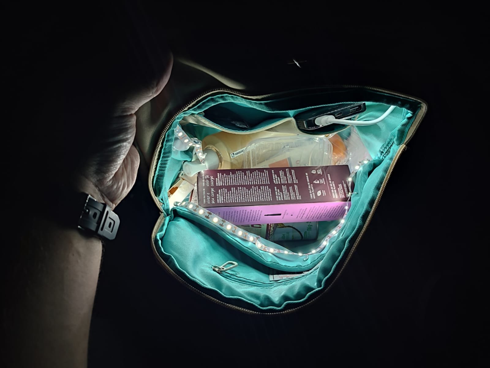 Uma bolsa inovadora que integra iluminação interna por LED e porta USB para recarga de dispositivos móveis, combinando design funcional, tecnologia e conveniência em um único produto.